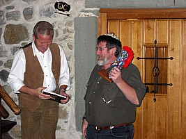 Die Hauptversammlung der VSAN am 12.-13.01. in Bad Cannstatt ist eine kleine "Wulf Wager Show". Die Wege im Bad Cannstatter Kurgebiet sind kurz und das Begleitprogramm ist Spitze. Beeindruckend ist der Besuch "Hinter den Kulissen der Wilhelma" am Sonntag. Hier sind die Termine der Fasnacht 2002 noch einmal in tabellarischer Form dargestellt. Am 21.01. stirbt unsere Blätzlemutter Gertrud Dietrich und wird am 30.01. beigesetzt. Die Anteilnahme der Blätzlebuebe ist groß. Mit Gertrud stirbt die letzte Blätzlemutter der Zunft - eine Ära geht zu Ende. Walter Kaiser tritt in seinen fasnächtlichen Ruhestand und wird Ehrenrat. Nach der Fasnacht geht es wieder ruhiger zu. Am 13.04.2002 ist Landschaftssitzung in Markdorf. Andreas Kaltenbach, Walter Bialoncig und Uli Topka nehmen daran teil. Die XXV. Tafel der Turmherren am 11. Mai ist sehr gut besucht. Angeführt vom MdB Hans-Peter Repnick, über Horst Sund, Rektor der Uni Konstanz a.D., bis hin zu unserem Landschaftsvertreter Otto Gäng und unserem Narrenfreund Alfred Heizmann ist alles vertreten, was in der Politik, der Wirtschaft und der Fasnacht Rang und Namen hat. Nach einem opulenten Mahl hält Narrenrat Uli Topka einen Multimedia-Vortag über die moderne Fasnachtsforschung und erläutert Trends in der Fasnachtsszene. Alle anwesenden Turmherren bekommen den neu geschaffenen Turmherrenorden. Alfred Heizmann gibt einige Anekdoten zum Besten und beweist damit seine humoristische Extraklasse - und, dass in der Kürze die Würze liegt. Danach werden Herbert Schenk und Karstadt-Direktor Raimund Franke zu Ehrenblätz ernannt. Besonders freuen wir uns über ein Geschenk von Horst Sund (Bild unten links). Er überreicht uns, wie schon in vielen Jahren zuvor, mehrere Fasnachtsbücher, -zeitschriften und -CDs.
